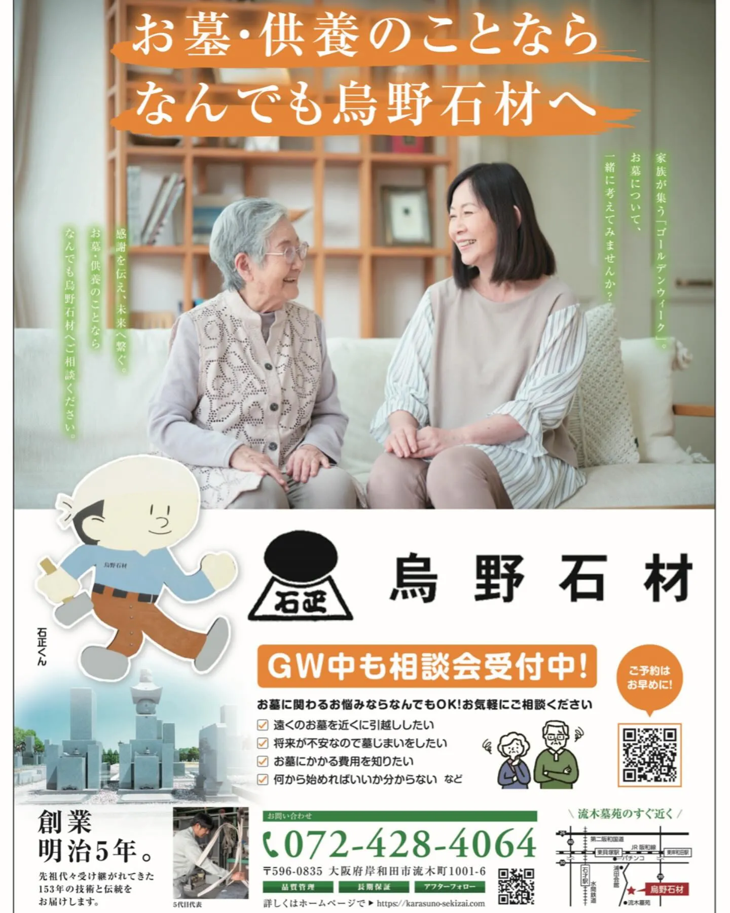 お彼岸も終わり日中汗ばむ季節になりました。 2026/04/10 お彼岸も終わり日中汗ばむ季節になりました。 ゴールデンウィークにご先祖様やご供養の事をお話しする良い機会ではないでしょうか? #お墓のことなら#烏野石材#墓地#ご供養#岸和田墓地#墓じまい 大阪で墓地選びのパートナー 墓地